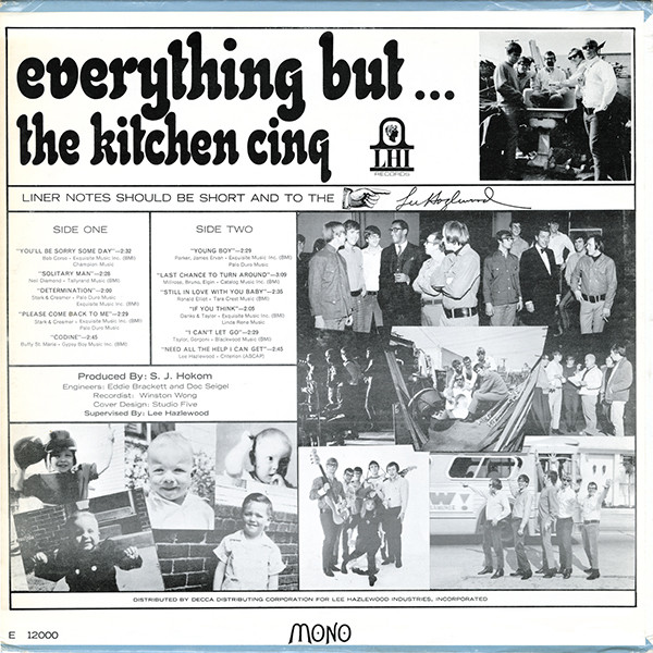 Le groupe change pour la première fois de nom et s’appelle The Y’Alls, ce qui semble se remarquer un peu plus que The Illusions. Mais là encore ils n’enregistrent qu’un single avec une reprise des Beatles, Run for your life. Le groupe finit par déménager à Los Angeles, où il se passe un petit peu plus de choses qu’au Texas, et prend le nom franco-anglo saxon The Kitchen cinq, soit la cuisine five. Le groupe signe alors avec le label de Lee Hazlewood, LHI et c’est d’ailleurs la petite amie de ce dernier, Suzi Jane Hokom, qui est à l’origine de ce troisième changement de nom. C’est aussi elle qui produit l’album Everything but... en 1967 qui est accompagné d’une poignée de singles.