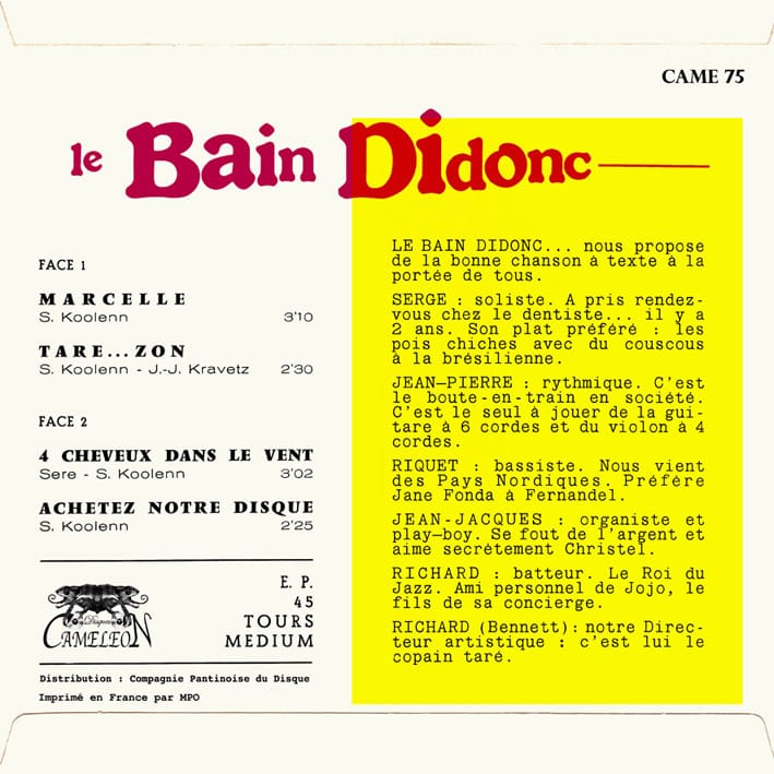 Pour qui s’est intéressé de près au french freakbeat et autres anti-yéyés, Bain Didonc n’est pas inconnu. Son unique EP, contient 4 titres, et l’un deux, Quatre cheveux dans le vent, se retrouve dans la compilation Psychegaelic – French Freakbeat, qui date de 1999. Mais jusqu’à maintenant, il fallait débourser plus de 300 euros pour avoir un pressage original écoutable. Le label Cameleon Records, qui se dépense sans compter pour donner une deuxième vie à ces 4 titres éparpillés, et reconstituer ainsi un patrimoine à redécouvrir, vient de le rééditer, avec pochette d’origine s’il vous plaît.